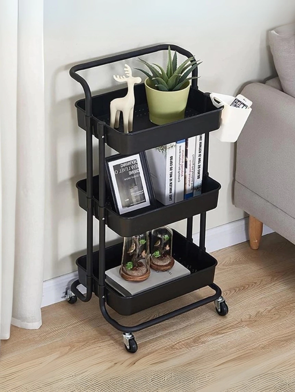 El carrito organizador de metal con ruedas Edda, cuenta con un mango y 4 ruedas que permite moverlo con facilidad y utilizarlo en cualquier espacio de tu hogar .