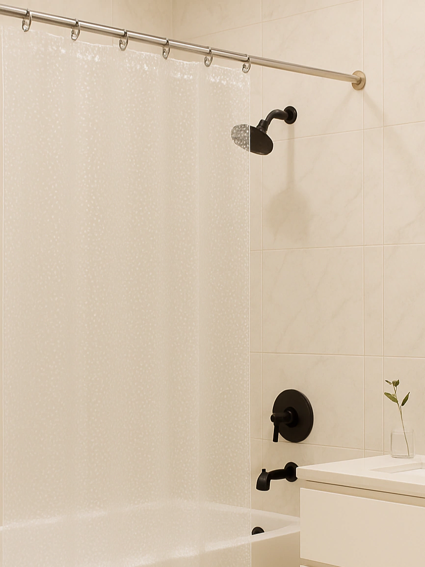 Lo que hace que nuestra cortina sea aún más especial, es su propiedad antiestática, lo que significa que no se adhiere incómodamente a tu cuerpo mientras te duchas. Además, cuenta con transparencias que permiten que la luz pase a través de ella, lo que la hace perfecta para baños con poca luminosidad. Un dato no menor es que permite el paso de la luz que junto con su efecto tridimensional desenfocan la silueta corporal brindando intimidad al momento de ducharse.