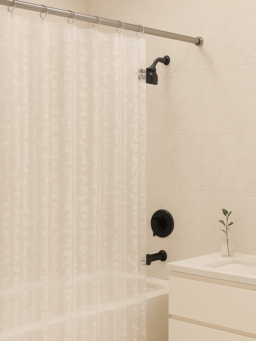 Lo que hace que nuestra cortina sea aún más especial, es su propiedad antiestática, lo que significa que no se adhiere incómodamente a tu cuerpo mientras te duchas. Además, cuenta con transparencias que permiten que la luz pase a través de ella, lo que la hace perfecta para baños con poca luminosidad. Un dato no menor es que permite el paso de la luz que junto con su efecto tridimensional desenfocan la silueta corporal brindando intimidad al momento de ducharse.