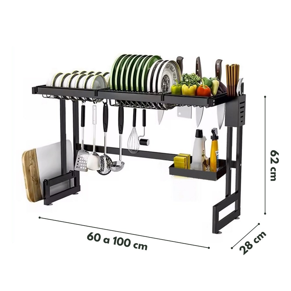 Incluye canasta rejilla para colocar esponja, detergente, escurridor de cubierto y accesorios que permiten que cuelgues tus utensilios También cuenta con un porta tabla.