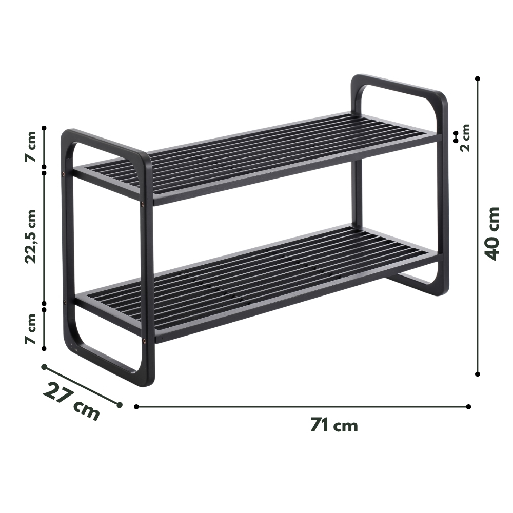 Con dos estantes espaciosos, ofrece un amplio lugar para mantener tus zapatos organizados y a la vista. Sus medidas de 71 cm de ancho, 27 cm de profundidad y 40 cm de alto lo hacen ideal para la entrada de tu casa o tu habitación, optimizando el espacio sin sacrificar la estética.